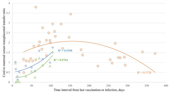 Time variable was presented as the time interval from delivery to the last antigen exposure, either the last vaccination or COVID-19 infection, whichever occurred last. Transfer ratios of antibodies were visualized as scattered plots and plotted as quadratic curves by polynomial regression approach against the time interval from last antigen exposure, to address the non-linear temporal dynamics seen in previous clinical observations [14].
