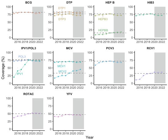 Fourteen antigens or combinations of antigens were tracked in the 2022 revision of the WUENIC (released in July 2023) [15]. All the following 14 antigens or combinations of antigens were considered in this study: Bacille Calmette–Guérin (BCG), measles-containing vaccine (first dose—MCV1; second dose—MCV2)), diphtheria–tetanus–pertussis-containing vaccine (first dose—DTP1; third dose—DPT3), oral poliovirus vaccine (third dose—POL3), inactivated poliovirus vaccine (first dose—IPV1), the first dose of the rubella-containing vaccine (RCV1), hepatitis B vaccine (birth dose—HEPBB; third dose—HEPB3), the third dose of the haemophilus influenzae type b vaccine (HIB3), the yellow fever vaccine (YFV), rotavirus vaccine (last dose—ROTAC) and the pneumococcal conjugate vaccine (third dose—PCV3). HEPBB coverage estimates were considered only for countries with the ability to record data within 48 hours of delivery. Some countries provided data on children vaccinated with the HEPBB but were unable to record vaccinations in a timely manner; therefore, coverage estimates were not made.