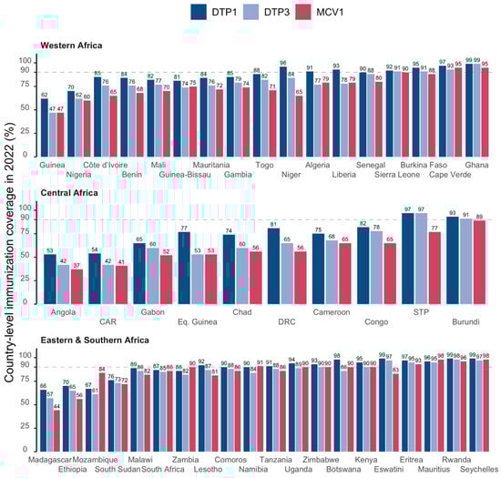 DTP1, DTP3 and MCV1 coverage by country in 2022 in the WHO African Region. The horizontal dashed lines represent the target coverage of 90%. Abbreviations: DTP1: first dose of diphtheria–tetanus–pertussis-containing vaccine; DTP3: third dose of diphtheria–tetanus–pertussis-containing vaccine; MCV1: first dose of measles-containing vaccine; CAR: Central African Republic; DRC: Democratic Republic of Congo; Eq. Guinea: Equatorial Guinea; STP: Sao Tome and Principe.