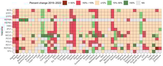 Percent change in immunization compared to 2019 in the 47 countries of the WHO African Region. Abbreviations: CAR: Central African Republic; DRC: Democratic Republic of Congo; Eq. Guinea: Equatorial Guinea; STP: Sao Tome and Principe; NA: data not available. BCG: Bacille Calmette–Guérin vaccine; DTP1: first dose of diphtheria–tetanus–pertussis-containing vaccine; DTP3: third dose of diphtheria–tetanus–pertussis-containing vaccine; HEPBB: hepatitis B vaccine birth dose; HEPB3: third dose of hepatitis B vaccine; HIB3: third dose of Haemophilus influenzae type b vaccine; POL3: third dose of oral poliovirus vaccine; IPV1: first dose of inactivated-poliovirus-containing vaccine; MCV1: first dose of measles-containing vaccine; MCV2: second dose of measles-containing vaccine; PCV3: third dose of pneumococcal conjugate vaccine; RCV1: first dose of rubella-containing vaccine; ROTAC: final dose of rotavirus vaccine; YFV: yellow fever vaccine.