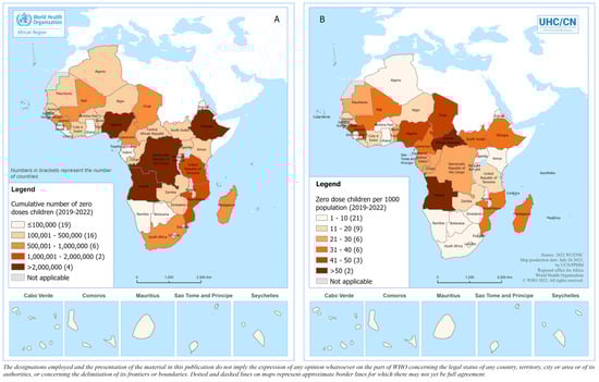 Geographical distribution of the (A) cumulative number of zero-dose children and (B) the cumulative number of zero-dose children per 1000 inhabitants in the WHO African Region during the pandemic period. The 2022 United Nations population estimates were used as the denominator [15].