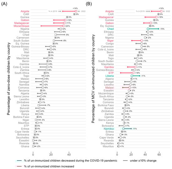 (A) The percentage of zero-dose children (i.e., children not immunized with the first dose of the diphtheria–tetanus–pertussis-containing vaccine (DTP1) in 2019 and 2022 and (B) the percentage of children not immunized with the first dose of the measles-containing vaccine (MCV1) in 2019 and 2022 by country in the WHO African Region. Abbreviations: CAR: Central African Republic; DRC: Democratic Republic of Congo; Eq. Guinea: Equatorial Guinea; STP: Sao Tome and Principe.