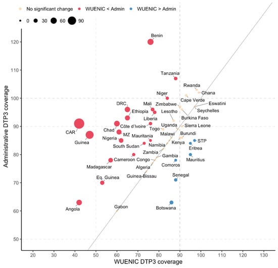 Countries’ administrative coverages in 2022 for DTP3 were compared to WHO and UNICEF estimates. Administrative coverages are self-reported by national authorities to the WHO and UNICEF on a yearly basis through JRFs and are calculated using the number of doses administered from health facilities as the numerator and national estimates of target populations as the denominator.