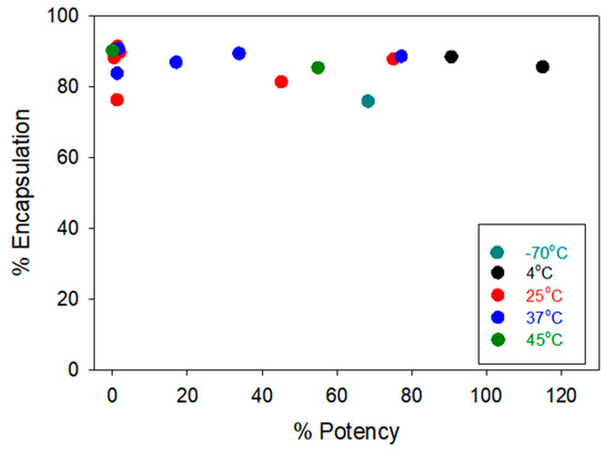 Correlations between the LNP encapsulation efficiency (%EE) in the y-axis and the cell-based relative potency in the x-axis. Each data point represents the average result tested at a single time point within its respective storage condition. For in vitro potency testing, samples were tested in duplicate (n = 2). For encapsulation efficiency testing, samples were tested in quadruplicate (n = 4).