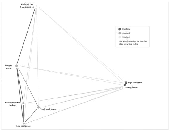 Risk assessments of COVID-19, confidence in the COVID-19 vaccine, and intent to vaccinate were frequently bundled by participants in their narrative for future COVID-19 vaccination behavior for their child(ren). A heatmap demonstrates how statements of high confidence in the COVID-19 vaccines by hesitant adopter parents were frequently linked to a strong intent to have their child(ren) receive future COVID-19 vaccine boosters (see Table 3). However, participants with low confidence in COVID-19 vaccines and boosters often expressed conditional and/or low/no intent to have their child(ren) receive COVID-19 boosters. The most frequently co-occurring coded segments were high confidence and strong intent to have their child(ren) receive the COVID-19 booster (co-occurring 134 times across all transcripts). The second most frequently co-occurring codes were vaccine/booster is risky and low/no intent, co-occurring 78 times. Participants’ statements were occasionally mixed or variable in their reported intent to vaccinate, with segments coded as strong intent sometimes co-occurring with segments coded as conditional and/or low/no intent (co-occurring 32 times across all interviews). We generated a cluster plot (Figure 1) of subthemes to highlight these findings; this figure demonstrates associations between high confidence and strong intent, perceived risk from the COVID-19 vaccine and low confidence with conditional intent and low/no intent, and perceptions of reduced risk from COVID-19 infection with low/no intent to have children receive COVID-19 boosters.