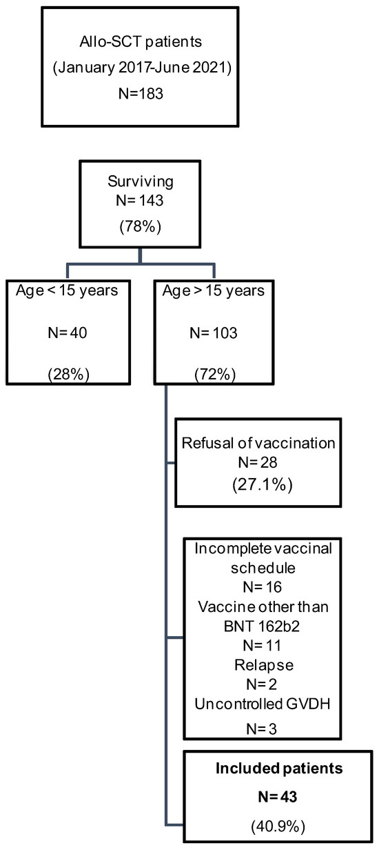 Figure 1. Study design. The study included all living ASCT patients aged 15 or more, fully vaccinated against SARS-CoV-2 with the Pfizer-BioNtech vaccine, and who were not in relapse of their underlying disease or had an uncontrolled GVHD (n = 43).