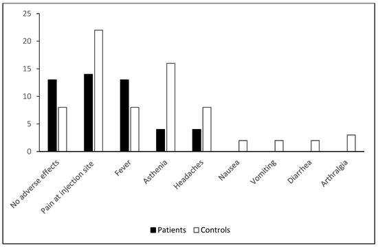 The comparative study of vaccination tolerance showed that the controls presented more adverse effects such as pain at the injection site and asthenia (p = 0.001, p < 0.001, respectively) than the patients, without any significant difference in the frequency of occurrence of adverse effects, all symptoms combined (p = 0.693).