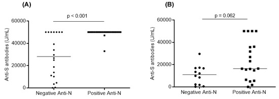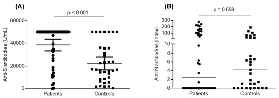 Figure 4. Distribution of anti-S antibody levels according to anti-N antibody positivity in patients (A) and controls (B). Along with dot plots, median values are shown. Mann–Whitney U test was used, and p values are shown.