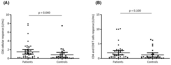 Figure 5. T cell response after SARS-CoV-2 vaccination. CD4+ (A) and CD4+ + CD8+ (B) T cell responses after SARS-CoV-2 vaccination were compared between patients and controls. Along with dot plots, median values are shown. Mann–Whitney U test was used, and p values are shown.