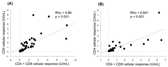 Figure 6. Correlation between CD4+ and CD4+ + CD8+ T cell responses. The correlation between the two types of cellular immune responses was analyzed using Spearman test in 43 patients (A) and 31 controls (B).
