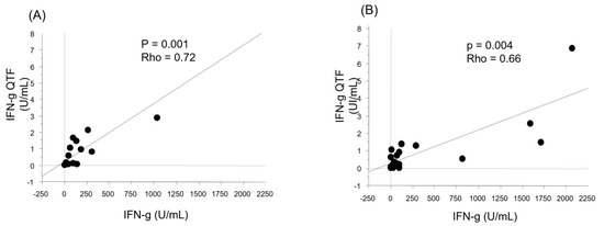 As shown in Figure 7, the IFN-γ level quantified by the multiplex technique in the supernatants of the QFN CD4+ and CD4+ + CD8+ tubes was correlated with that assayed by the ELISA technique (p = 0.001, Rho = 0.72; p = 0.004, Rho = 0.66, respectively).
