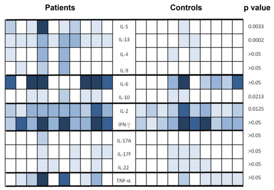 Figure 8. Schematic representation of Th1/Th2/Th17 cytokine profile in patients and controls. Th1, Th2, and Th17 cytokines were measured in the supernatant of lymphocytes stimulated with SARS-CoV-2 antigens from Quantiferon tubes in a subgroup of 10 ASCT patients and 10 controls. The superior result obtained within the CD4+ and the CD4+ and CD8+ tubes is shown. The intensity of the color is correlated with the cytokine level. Comparison of cytokine levels between patients and controls was performed using Mann–Whitney U test, and p values corresponding to each cy tokine are shown on the same line.