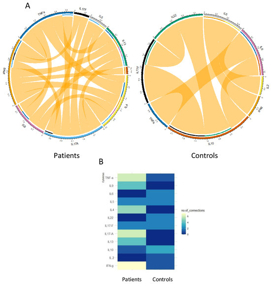 Figure 9. Network analysis of Th1/Th2/Th17 cytokine correlation matrices in patients and controls. (A) Circos plots illustrate the correlation networks built according to Spearman correlation matrices. Each bar represents a different parameter. The length of each bar is proportional to the number of significant correlations. The connecting lines represent statistically significant correlations (p < 0.05). Yellow connecting lines represent positive correlations. The thickness of the connecting lines is proportional to the Spearman correlation coefficient value. Markers that did not exhibit statistically significant correlations are now shown in the Circos plots. (B) Node analysis: heatmap shows the number of statistically significant correlations involving each marker per clinical group.