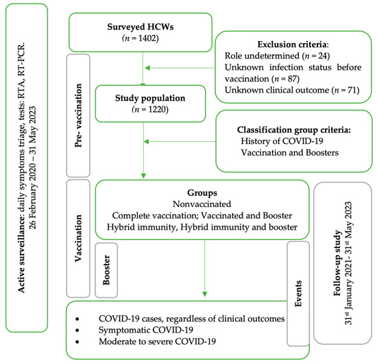 The HCWs population studied had 2 inclusion criteria: the employment contract within INBI “Prof. Dr. Matei Balș” and being actively on duty at least 12 months after the start of the vaccination campaign. HCWs were excluded if the professional role, the history, and the clinical outcome of the SARS-CoV-2 infection were undetermined. The case definitions according to the national methodology were applied, considering a new infection when a positive test occurred 90 days after a previous infection [14]. The HCWs were diagnosed with COVID-19 once, twice, or three times. The HCWs with three SARS-CoV-2 infections did not meet the above inclusion criteria. This resulted in a database of uninfected HCWs with one or two COVID-19 episodes. Our study population was singly censored through right censoring. The study workflow and the timeline of the surveyed events are represented in Figure 1.