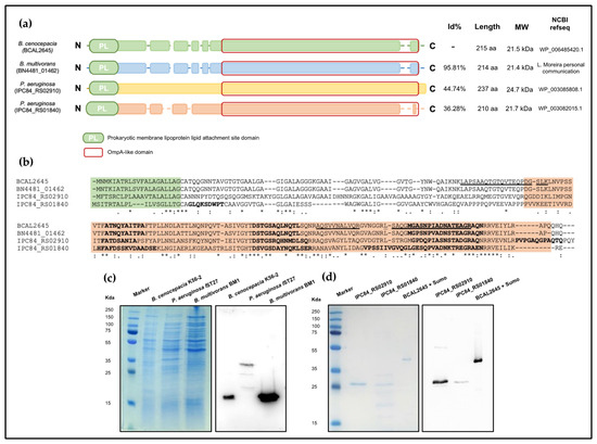 Alignment of amino acid sequences of B. cenocepacia J2315 BCAL2645 protein with the homologs IPC84_RS02910 and IPC84_RS01840 from P. aeruginosa IST27 and BN4481-01462 from B. multivorans BM1. (a) Analysis of BCAL2645 homolog proteins, showing the conserved domains and sequence identity (Id%). The length, molecular weight (MW) and National Center for Biotechnology Information (NCBI) reference sequence are also showed for the 4 proteins. (b) Amino acid sequence alignment of B. cenocepacia J2315 BCAL2645 protein, P. aeruginosa IST27 IPC84_RS02910 and IPC84_RS01840 proteins, and B. multivorans BM1 BN4481_01462. Bioinformatic predictions of B-cell epitopes are marked in bold. Prokaryotic membrane lipoprotein lipid attachment site domain (PS51257) and OmpA-like domain (PS51123) are highlighted in green and orange, respectively. The BCAL2645 surface-exposed peptides previously identified by Sousa et al. [38] are underlined. Asterisks indicate identical amino acid residues, one or two dots indicate semi-conserved or conserved substitutions, respectively. (c) SDS-PAGE and Western blot analysis using the polyclonal anti-BCAL2645 antibody and the whole proteins of B. cenocepacia K56-2, P. aeruginosa IST27 and B. multivorans BM1 (d) SDS-PAGE analysis of the purified recombinant proteins and Western blot analysis using the polyclonal anti-BCAL2645 antibody against the purified recombinant proteins IPC84_RS02910 and IPC84_RS01840 of P. aeruginosa IST27. The BCAL2645 protein, overexpressed with a N-terminal SUMO fusion, was used as a positive control.