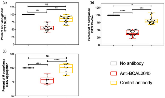 The anti-BCAL2645 antibody reduces cell–cell aggregation in P. aeruginosa and its ability to form thicker biofilms. (a,b) Anti-BCAL2645 pAb (20 µg/mL) inhibits P. aeruginosa IST27 biofilm formation at 24 and 48 h, respectively, and (c) the cell–cell aggregation in liquid culture. Results were expressed as percentage of biofilm and aggregation relatively to biofilm and aggregation of P. aeruginosa IST27 strain with no treatment. The pAb anti-Hfq was used as the control antibody. Statistics were determined using by one-way ANOVA. All the results are presented as the mean from three independent experiments, error bars indicate SD. (****, p < 0.0001; ***, p < 0.001, **, p < 0.01; * p < 0.05; NS, not significant).