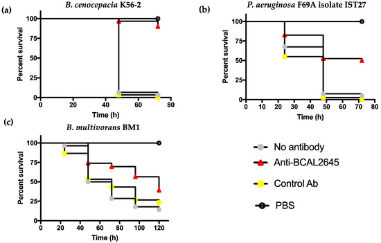 The protective effect of the anti-BCAL2645 antibody against infection by P. aeruginosa and the different Burkholderia strains was assessed using the animal model Galleria mellonella. Prior to injection in the larvae, bacterial strains were incubated with the anti-BCAL2645 pAb. The pre-incubation of bacteria with the antibody led to a 90% survival of the larvae infected with B. cenocepacia K56-2 after 3 days (Figure 4a).