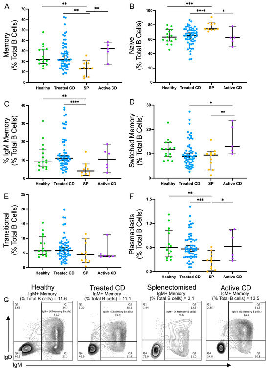 Frequencies of B cell populations in healthy, treated CD, active CD, and splenectomised cohorts. The frequencies of the following B cell populations are shown for each cohort as a proportion of the total B cell population: memory B cells ((A); CD20+CD27+CD10−), naïve B cells ((B); CD20+CD27−CD10−), IgM memory B cells ((C); CD20+CD10−CD27+IgM+IgG−IgA−), switched memory B cells ((D); CD20+CD10−CD27+IgM−IgG+IgA+), transitional B cells ((E); CD20+CD10+CD27−), and plasmablasts ((F); CD20+CD27hiCD38+). Representative flow plots from each cohort show memory B cells with an IgM+ gate (G). Frequencies are compared using Mann–Whitney U-tests (two-tailed). Horizontal lines on graphs indicate median, and error bars indicate 95% confidence intervals. * p < 0.05, ** p < 0.01, *** p < 0.001, and **** p < 0.0001.