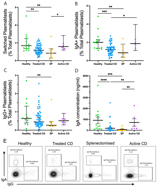 IgM memory B cells responses following TD stimulation. Frequencies of switched plasmablasts ((A); CD20+CD27hiCD38+IgA+/IgG+), IgA+ plasmablasts ((B); CD20+CD27hiCD38+IgA+IgG−), and IgG+ plasmablasts ((C); CD20+CD27hiCD38+IgA−IgG+) are shown as a proportion of total plasmablasts (CD20+CD27hiCD38+). Secreted IgA concentration (ng/mL) is shown (D). Representative flow plots show the frequency of IgA and IgG plasmablasts from the healthy, treated CD, and splenectomised (SP) cohort (E). Frequencies are compared using Mann–Whitney U-tests (two-tailed). Horizontal lines on graphs indicate median, and error bars indicate 95% confidence intervals. * p < 0.05, ** p < 0.01, *** p < 0.001, and **** p < 0.0001.