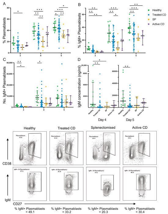 Next, IgM memory B-cell responses to TI stimulation were examined (Figure 3). IgM memory B cells isolated from active CD, treated CD, and splenectomised cohorts demonstrated significantly reduced differentiation into antibody-secreting plasmablasts compared to healthy donors after 4 and 5 days (Figure 3A). This decreased differentiation potential was significantly more pronounced in cultures from splenectomised individuals, compared to the treated CD group (p < 0.01). The frequency of IgM+ plasmablasts generated fell below the healthy range in 61% (17/28) of treated CD on day 3, in 38% (17/44) on day 4, and in 28% (15/54) on day 5 (Figure 3B). Again, this reduction was greater in splenectomised participants than treated CD, but only on day 4 (median, 7.73% vs. 18.05%; p = 0.03). This reduction in frequency corresponded to a lower absolute count of IgM+ plasmablasts in the treated CD and splenectomised cohorts compared to healthy controls on day 3 (median, 524, 572, and 1393; p = 0.001, p = 0.03, respectively) and day 4 (median, 4150, 3382, and 8738; p = 0.02, p = 0.06, respectively; Figure 3C), with these populations more than halved in treated CD participants.