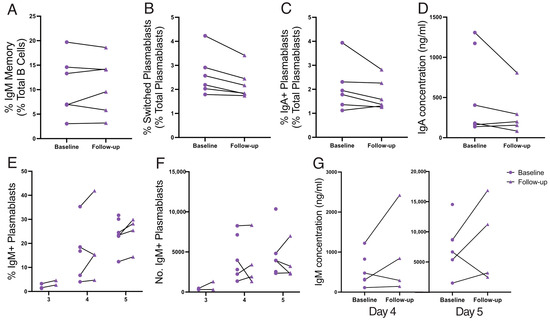 Spleen function from active disease (baseline) to follow-up at 6 months on a GFD. IgM memory B-cell frequency is shown (A). Sort-purified IgM memory B cells after TD stimulation: frequencies of switched plasmablasts (B) and IgA+ plasmablasts (C), and secreted IgA concentration (ng/mL; (D)). Sort-purified IgM memory B cells after TI stimulation: frequency (E) and absolute number (F) of IgM+ plasmablasts, and IgM concentration (ng/mL; (G)). Frequencies are compared using Wilcoxon matched-pairs tests (two-tailed).