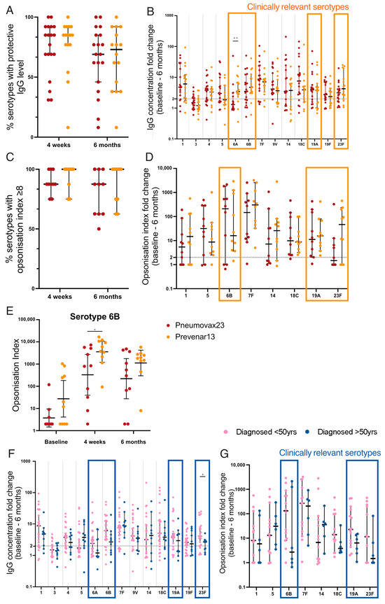 Antibody titre and opsonisation index after pneumococcal vaccination in CD patients. Each data point represents the proportion of serotypes with protective IgG concentrations ((A); ≥2 fold-change) or opsonisation index ((C); OI ≥ 8). Fold change from baseline to 6 months post vaccination is shown for IgG concentration (B) and opsonisation index (D); protective threshold ≥2-fold change (indicated by dashed line); clinically relevant serotypes indicated by orange boxes. Opsonisation index is shown for serotype 6B at all three timepoints (E). (F,G) Treated CD patients stratified by age at diagnosis. Fold change from baseline to 6 months post vaccination is shown for IgG concentration (F) and opsonisation index (G); clinically relevant serotypes indicated by blue boxes. Mann–Whitney U-tests were performed to compare fold changes. Horizontal lines indicate median, and error bars indicate 95% confidence intervals. Pneumococcal serotype-specific antibody concentrations were log (base 10) transformed and compared between vaccines using two-tailed t-tests (E). * p < 0.05, ** p < 0.01.