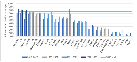 Additionally, there were six countries providing data on influenza vaccination coverage for the 2022–2023 season. During the analyzed period, five of these six countries achieved the highest levels of influenza vaccination coverage of all included countries. This finding possibly underscores that countries that invest the most in a comprehensive and integrated approach to infectious disease prevention through vaccination also tend to be the ones that have earlier/more complete data on vaccine coverage.