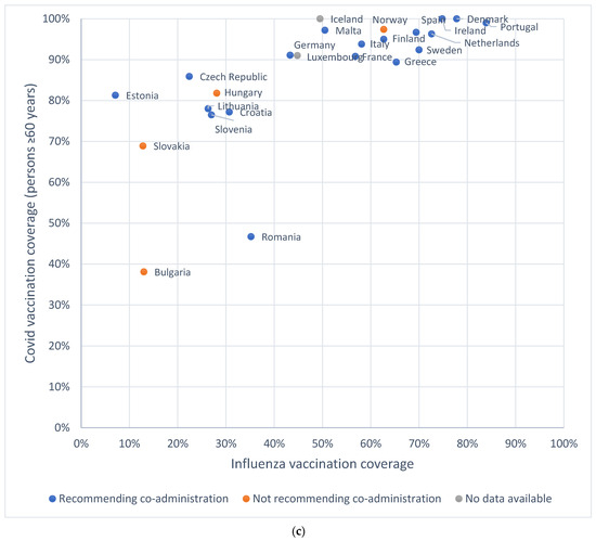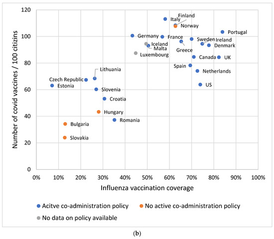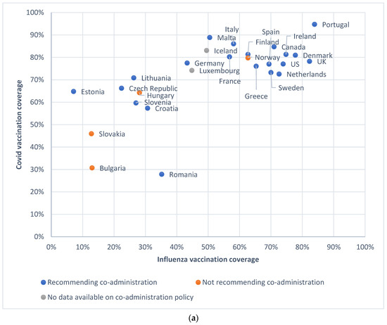 In this review, we describe the policy on co-administration and vaccination coverage of COVID-19 and influenza in all EU countries (Austria, Belgium, Bulgaria, Croatia, Cyprus, Czech Republic, Denmark, Estonia, Finland, France, Germany, Greece, Hungary, Italy, Ireland, Latvia, Lithuania, Luxembourg, Malta, the Netherlands, Poland, Portugal, Romania, Spain, Slovakia, Slovenia, and Sweden), Iceland, Norway, UK, US, and Canada. We did not include countries in the Southern Hemisphere due to the temporal variation in the emergence of influenza, which occurs at a different time compared to the Northern Hemisphere [10,11]. All data were collected retrospectively and accessed in May 2023.