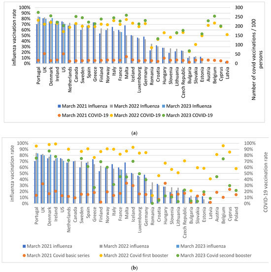 (a) Influenza vaccination coverage among persons ≥65 years and number of COVID-19 vaccinations/100 citizens on 31 March 2021, 2022, and 2023. Due to lacking data, we used an earlier date for the number of COVID-19 vaccinations/100 citizens in 2023 for Canada (2 February 2023), Cyprus (22 February 2023), and Hungary (4 December 2022). (b) Influenza vaccination coverage among persons ≥65 years and COVID-19 vaccination rate among persons ≥60 years on 31 March 2021 (basic series), 2022 (first booster), and 2023 (second booster).