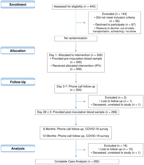 Interestingly, countries that use OPV for their childhood vaccination campaigns have reported lower incidence rates of SARS-CoV-2 infection compared with those that solely use IPV [50]. Accordingly, nearly all studies examining the effects of poliovirus vaccination on COVID-19 morbidity and mortality have focused on OPV [51,52,53,54,55,56,57,58]. To date, the only published study examining the effects of IPV on SARS-CoV-2 RdRp is an in vitro retrospective analysis of polio-immune serum samples. Comunale et al., (2021) observed that SARS-CoV-2 RdRp antibodies are able to recognize one or more epitopes in poliovirus RdRp. Moreover, polio-immune sera may inhibit viral SARS-CoV-2 cytopathic activity [59]. Herein, a prospective clinical trial that inoculated 300 adults with IPV and documented participant-reported COVID-19 outcomes for 12 months is described in a secondary analysis. Factors related to vaccination histories are explored, including how influenza, IPV, OPV, and COVID-19 vaccinations may impact SARS-CoV-2 positive infection results and/or experiences related to COVID-19 symptoms 12 months post-IPV inoculation.