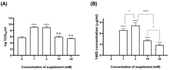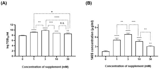 Comparison of SAT3 ZIM virial titer and antigen productivity at various CaCl2 concentrations. BHK-21 suspension cells were treated with 30, 10, 3, and 1 mM CaCl2 simultaneously (MOI: 0.01) and cultured for 24 h at 37 °C. The virial titer (A) and antigen productivity (B) were measured by virus titration and SE-HPLC. Each experiment was conducted three times, and the error bars indicate SDs from the mean. n.s., non-significant; * p < 0.05, ** p < 0.01, *** p < 0.005, **** p < 0.001; unpaired t-test.