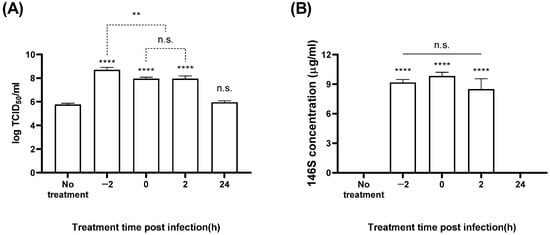 Antigen production in SAT1 BOT according to the timing of CaCl2 addition. The BHK-21 suspension cells were treated with 3 mM calcium chloride at 2 h before FMDV infection (MOI: 0.01), at FMDV infection, 2 hpi, and 24 hpi. The virial titer (A) and antigen productivity (B) were determined in the culture supernatant after 24 h. Each experiment was conducted three times, and the error bars indicate SDs from the mean. n.s., not significant; ** p < 0.01, **** p < 0.001; unpaired t-test.