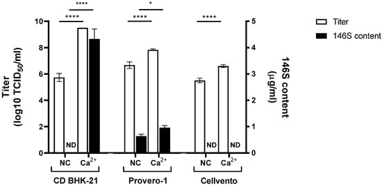 Effect of CaCl2 addition on SAT1 BOT virus titer and antigen production in various media. Three mM of CaCl2 was added at 0 hpi with SAT1 BOT in 30 mL of CD-BHK 21, Provero-1, or Cellvento medium. White bars indicate viral titer. Black bars indicate FMD vaccine antigen content measured using SE-HPLC. Each experiment was conducted three times, and the error bars indicate SDs from the mean. ND, not detected, * p < 0.05, **** p < 0.001; unpaired t-test.