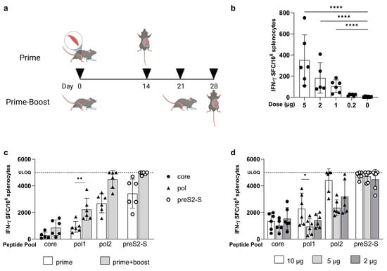 Evaluation of induced immune responses in naïve C57BL/6 mice after vaccination with MC3-formulated mRNA vaccine encoding for one HBV antigen. (a) Dosing scheme for prime and prime/boost strategy. Mice that were only primed received a vaccine on day 0 where responses are evaluated on day 14. In a prime/boost strategy, mice received a prime (day 0) and a boost (day 21) with an evaluation of the responses on day 28 (created with BioRender.com, accessed on 19 January 2024). (b) Induced immune responses, as measured by IFN-γ ELISpot (vertical axis), in a dose range (horizontal axis) finding (5, 2, 1, and 0.2 µg) after a prime dose of core-expressing mRNA (n = 6). (c) Induced immune responses, as measured by IFN-γ ELISpot (vertical axis), split per peptide stimulus (horizontal axis) in a comparison between prime (white) and prime/boost (grey) dosing schedules for the dosed formulated mRNA core (circles), pol (triangles), and preS2-S (open circles) at 5 µg (n = 6). (d) Induced immune responses, as measured by IFN-γ ELISpot (vertical axis), split per peptide stimulus (horizontal axis) in a comparison between different doses (10 µg white, 5 µg light grey, and 2 µg dark grey) of formulated mRNA core (circles), pol (triangles), and preS2-S (open circles) in a prime/boost dosing strategy (n = 6). Results are shown as mean ± standard deviation. Statistical analysis is performed by one-way ANOVA of the mean of log10 transformed data points (* p ≤ 0.05, ** p ≤ 0.01, ****, p ≤ 0.0001).