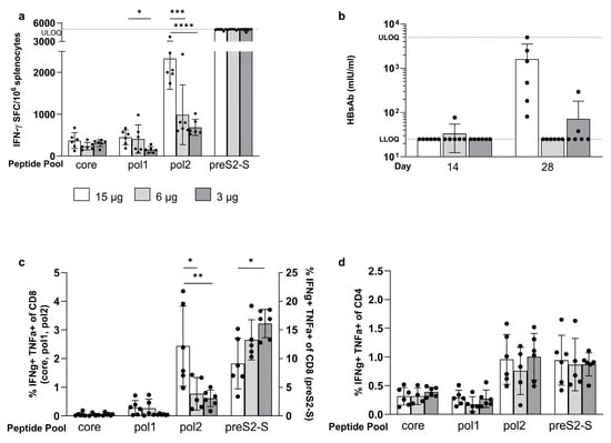 A vaccine for human use would ideally have all the antigens coformulated to allow for a single injection, and thus this approach was tested in mice to see how responses compare to when the antigens were tested individually. mRNAs encoding for each of the antigens were individually formulated into LNPs and then combined at doses of 1, 2, or 5 µg of each antigen expressing mRNA. Prime/boost regimen of total mRNA doses of 3, 6, or 15 µg were tested in naive C57BL/6 mice, eliciting responses to all antigens. The preS2-S recall responses exceeded maximum detectable levels at all dose levels, and no dose effect was observed for core-specific responses. A dose–response was observed, however, with pol where the 15 µg dose gave stronger pol1 responses than the 3 µg dose (448 ± 179 versus 153 ± 75.5, p = 0.035) (Figure 3a). Responses to pol2 were significantly greater with 15 µg than with 3 µg (687 ± 193 versus 2328 ± 734, p < 0.0001) as well as with 6 µg (988 ± 714 versus 2328 ± 734, p = 0.0002). Of note, it was observed that for the coformulation, the magnitude of pol-specific induced responses decreased significantly compared to the responses for the single-antigen vaccine (Figure S2). Core-specific responses were not significantly impacted, and for preS2-S, this could not be assessed as values reached ULOQ.