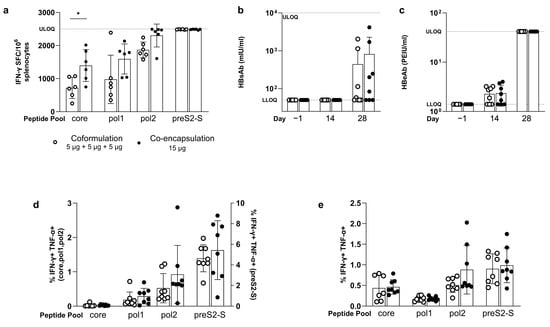 Evaluation of induced immune responses in naive C57BL/6 mice after vaccination with coformulated versus co-encapsulated (MC3) mRNA encoding for HBV antigens. Naive C57BL/6 mice (n = 6) were dosed via prime/boost strategy using coformulated (open circles) or co-encapsulated (closed circles) mRNA encoding for the three HBV antigens using a total of 15 µg. (a) Induced immune responses, as measured by IFN-γ ELISpot (vertical axis), split by peptide stimulation (horizontal axis). Levels of induced anti-HBs (b) and anti-HBe (c) antibodies (vertical axis) in the serum measured via CLIA one day −1, 14, and 28 (horizontal axis). % of polyfunctional CD8+ T cells (d) and CD4+ T cells (e) defined as % of IFN-γ and TNF-α double positive cells of parent (vertical axis), split per peptide stimulation (horizontal axis). Results are shown as mean ± standard deviation. Statistical comparison is performed by unpaired t-test or one-way ANOVA on log10 transformed data for ELISpot and antibodies, and on logit transformed data for ICS (* p ≤ 0.05).