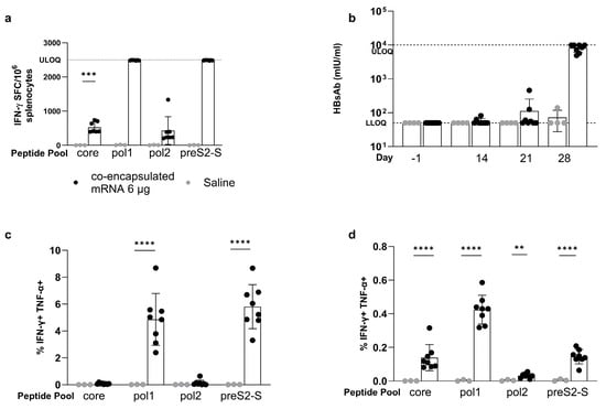 Evaluation of induced immune responses in naive BALB/c mice after vaccination with ALC-0315-co-encapsulated mRNA encoding for HBV antigens. Naive BALB/c mice were dosed via a prime/boost strategy using co-encapsulated mRNA encoding for the three HBV antigens using 6 µg (black circles, n = 8) and were compared to saline control (grey circles; n = 4). (a) Induced immune responses, as measured by IFN-γ ELISpot (vertical axis), split by peptide stimulation (horizontal axis). (b) Induced concentrations of anti-HBs (vertical axis), measured by CLIA, on day −1, 14, 21, and 28 (horizontal axis). % of polyfunctional CD8+ T cells (c) and CD4+ T cells (d) defined as % of IFN-γ and TNF-α double positive cells of parent (vertical axis), split per peptide stimulation (horizontal axis). Results are shown as mean ± standard deviation. Statistical comparison is performed by unpaired t-test or one-way ANOVA on log10 transformed data for ELISpot and antibodies, and on logit transformed data for ICS (** p ≤ 0.01, *** p ≤ 0.001, and **** for p ≤ 0.0001).