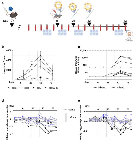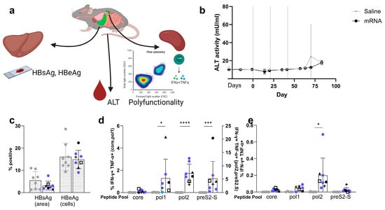 Evaluation of ALC-0315-co-encapsulated mRNA vaccine in AAV-HBV-transduced C57BL/6 mice. (a) Scheme of AAV-HBV-transduced mouse experiment where the mice were dosed 77 days after transduction (n = 8). Vaccination with co-encapsulated mRNA vaccine occurred three times with 21-day intervals where the first dose was set on day 0. Blood was drawn weekly (red tubes), and on day −14, 7, 28, 49, and 79 post dosing, leucocytes were isolated for IFN-γ ELISpot (plates). On all other weeks, HBsAg, HBeAg, anti-HBs, and anti-HBe were measured. Mice were vaccinated at 10 µg (black) compared to saline control (grey). (created with BioRender.com, accessed on 19 January 2024) (b) Induced immune responses (mean ± SD) over time (horizontal axis), as measured by IFN-γ ELISpot (vertical axis), split per peptide stimulation (core: circles; pol1: triangles; pol2: reverse open triangles; and preS2-S, squares). (c) Induced concentrations (vertical axis) of anti-HBs (triangles) or anti-HBe (circles) antibodies, measured via CLIA for vaccinated (black) and saline control (grey) shown for each individual mouse. Log10 change from baseline (vertical axis) for concentrations of HBsAg (d) and HBeAg (e) measured via CLIA for mRNA-vaccinated mice (blue circles for the mice without effect on HBsAg levels and black for the mice with >1 log10 reduction in HBsAg levels, for which each mouse is visualized with a different symbol that reoccurs in subsequent figures); and saline control (grey) shown for each individual mouse.
