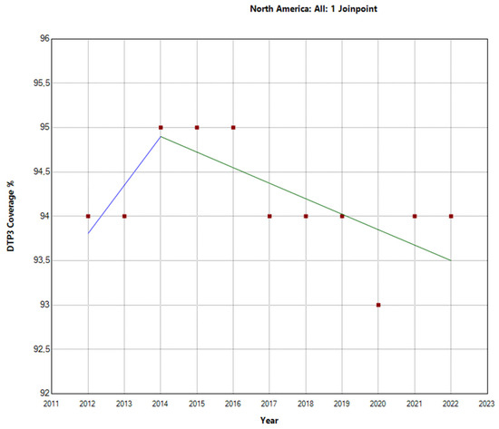 Joinpoint graph of DTP3 in North America, 2012–2022 indicate joinpoints at the transitions between colored lines. (Power = 0.0303).