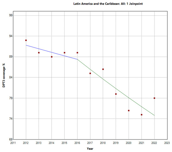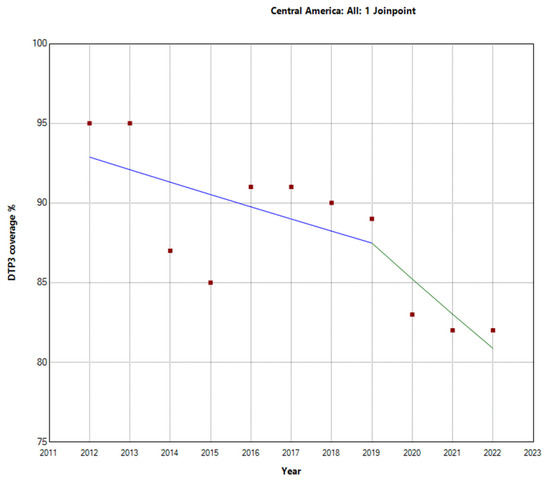 In contrast, Latin America and the Caribbean exhibited a more pronounced decline in vaccination rates. The total period APC was −2.1% (95% −2.7 to −1.5). Further analysis within this region revealed a Joinpoint in 2016. There were two distinct periods: the first period (2012–2016) showed an APC of −0.9% (95% CI: −4.4, 2.6, p = 0.531), indicating a stable trend. However, during the second period (2016–2022), the decline in vaccination rates was more substantial, with an APC of −2.7% (95% CI: −4.5, −0.9, p = 0.010), indicating a decrease in vaccination rates, as shown in Figure 3. These findings highlight substantial regional differences in third-DTP-dose-coverage trends within Latin America and the Caribbean, which are visually depicted in Figure 4, Figure 5 and Figure 6, illustrating the third-DTP-dose-vaccination-rate trends in Central America, the Caribbean, and South America, respectively, highlighting the Joinpoints.