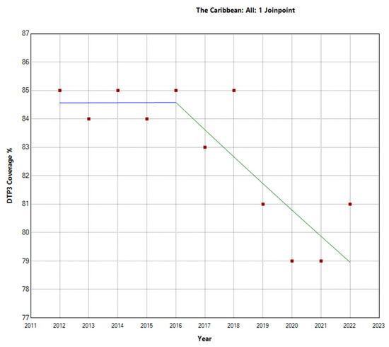 The Caribbean region showed a different pattern, with an overall decrease in the vaccination rate with an APC of −0.7% (95% CI −1.1, −0.4; p = 0.001). There was a Joinpoint in 2016 (Figure 5). In the second period (2016–2022), there was a decrease with an APC of −1.1% (95% CI −2.1, −0.1; p = 0.031).