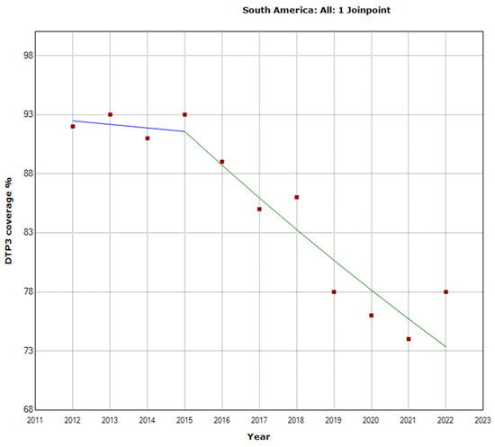Joinpoint graph of DTP3 in South America 2012–2022 indicate joinpoints at the transitions between colored lines. (Statistical Power: 0.999).