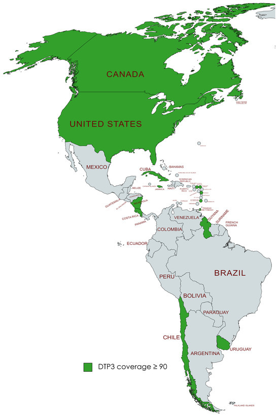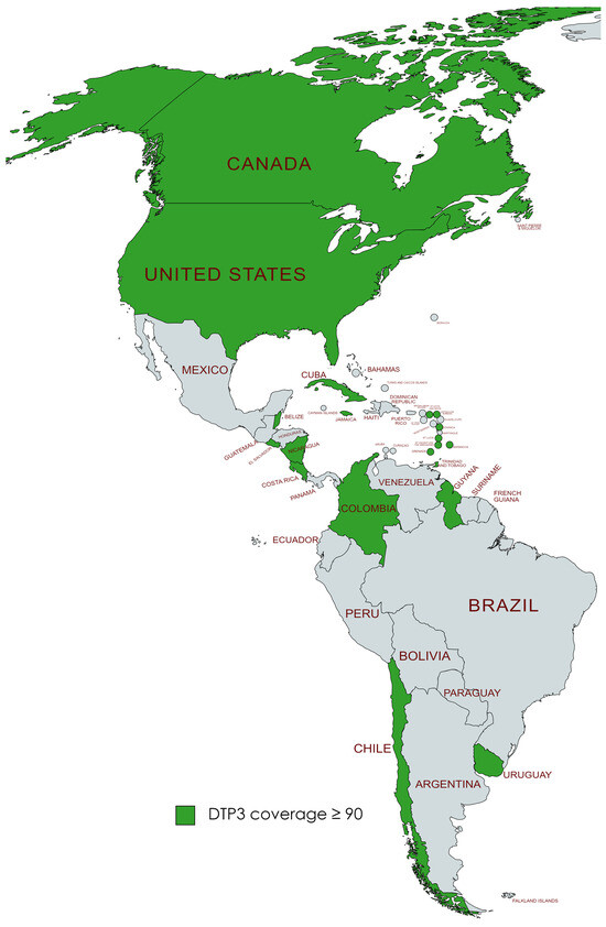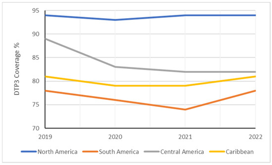 Regional aggregated data for North America, Latin America, and the Caribbean were obtained from the United Nations Children’s Fund. Due to the absence of regional data from South America, Central America, and the Caribbean in the United Nations Children’s Fund data, we calculated these figures using birth-weighted vaccination rates. This method of calculating data, based on the births in each country, was essential for deriving accurate estimations of DTP3-vaccination coverage in these regions. The countries included in each region were as follows: in Central America, the countries were the Republic of Guatemala, the Republic of Panama, the Republic of Costa Rica, the Republic of Nicaragua, the Republic of El Salvador, the Republic of Honduras, and Belize. In North America, the countries assessed included the United States of America, the United Mexican States, and Canada. The Caribbean region’s analysis encompassed Jamaica, Saint Lucia, Grenada, the Bahamas, the Republic of Cuba, Saint Vincent and the Grenadines, Barbados, the Republic of Haiti, the Republic of Trinidad and Tobago, the Dominican Republic, the Federation of Saint Kitts and Nevis, Antigua and Barbuda, and the Commonwealth of Dominica. Lastly, in South America, the countries involved were the Federative Republic of Brazil, the Republic of Chile, the Bolivarian Republic of Venezuela, the Republic of Peru, the Argentine Republic, the Republic of Ecuador, the Plurinational State of Bolivia, the Republic of Colombia, Uruguay, Paraguay, Suriname, and Guyana.