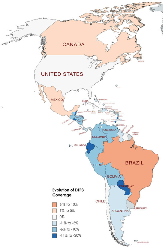 Conversely, eight countries demonstrated stability in their DTP3-vaccine coverage during the same period. Countries such as Chile, Costa Rica, Cuba, Haiti, Suriname, Trinidad and Tobago, the United States, and Uruguay maintained their coverage levels, with no percentage change observed. However, the study also identified 22 American countries where there was a decline in DTP3-vaccine coverage (Argentina, Bahamas, Barbados, Belize, Saint Kitts and Nevis, Bolivia, Colombia, Guyana, El Salvador, Nicaragua, Saint Lucia, Paraguay, Saint Vincent and the Grenadines, Ecuador, Honduras, Venezuela, Guatemala, Panama, Grenada, Peru, Dominica, and the Dominican Republic). The Dominican Republic, Guyana, Panama, and Saint Kitts and Nevis experienced a 1% decrease, while Argentina faced a 2% decline. In nations with declining vaccination coverage, the average absolute decrease was −7.37%, with a standard deviation of 5.39 (Table 4) (Figure 8, Figure 9 and Figure 10).
