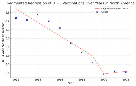Segmented regression analysis of DTP3 in North America, representing the actual DTP3-vaccination numbers (in dark blue) against the predicted values from the segmented regression (in light coral).