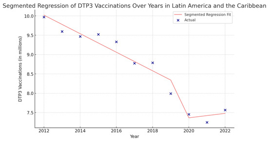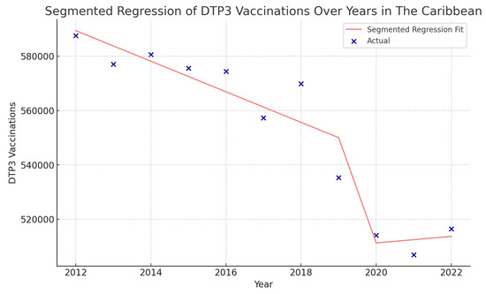 Segmented regression analysis of DTP3 vaccination in Latin America and the Caribbean. The actual DTP3-vaccination numbers (in dark blue) against the predicted values from the segmented regression (in light coral).