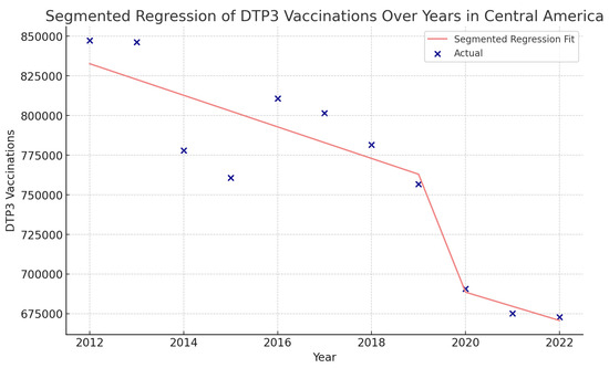 Segmented regression analysis of DTP3 vaccination in Central America. The actual DTP3 (in dark blue) against the predicted values from the segmented regression (in light coral).