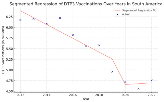Segmented regression analysis of DTP3 vaccination in South America. The actual DTP3 numbers (in dark blue) are represented against the predicted values from the segmented regression (in light coral).
