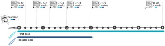 In the baseline questionnaire, information on vaccinees’ characteristics, including demographics, medical history (i.e., cardiovascular disorder, diabetes mellitus, hypertension, liver disorder, lung disorder, mental disorder, malignant tumor, nervous system disorder, and renal disorder), concomitant drug use, and administered COVID-19 vaccine dose and brand, were collected. In addition, for people with prior SARS-CoV-2 infection, information on the dates and symptoms relevant to the infection was collected. Moreover, vaccinees filled out a total of six follow-up questionnaires (FU-Qs) during the six months after the first dose of COVID-19 vaccines, and five follow-up questionnaires over a 3-month follow-up period were provided for those recruited at the booster dose (Figure 1). Participants could register for the booster dose via the web app until 30 November 2022. FU-Qs were stored until 28 February 2023.