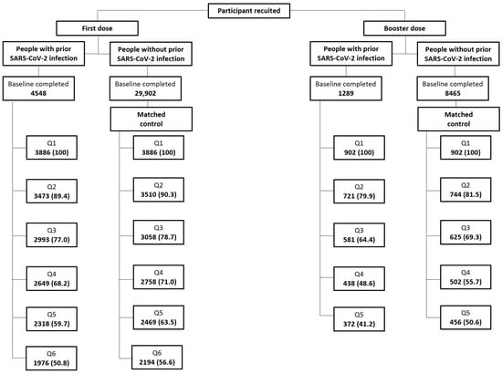 Regarding subjects included in the analyses, after the first vaccination cycle, 50.8% of the vaccinees with prior SARS-CoV-2 infection and 56.6% of the matched controls filled out all six FU-Qs, while only 41.2% of the vaccinees with prior SARS-CoV-2 infection and 50.6% of the matched controls completed all five FU-Qs after the booster dose (Figure 2).